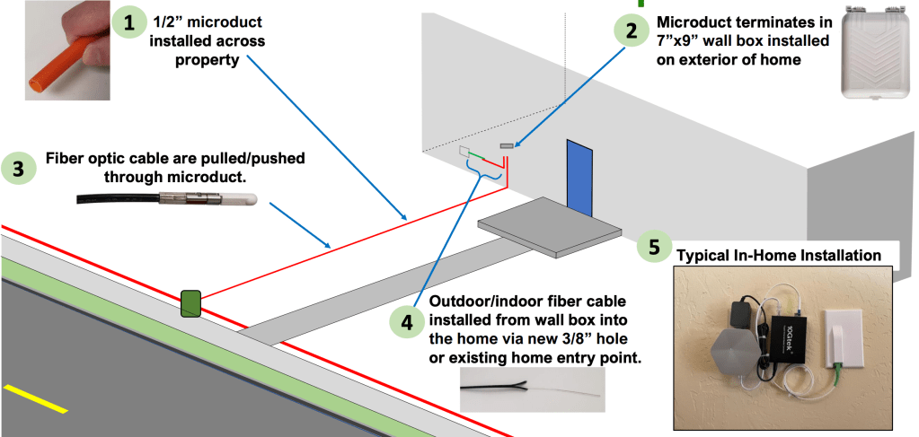 - A 1/2-inch microduct is installed from the fiber backbone across your property.
