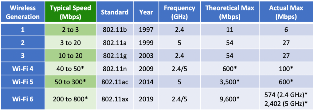 * These values vary based on MIMO implementation (MIMO = Multiple Input Multiple Output = multiple transmitters and receivers operating in parallel)